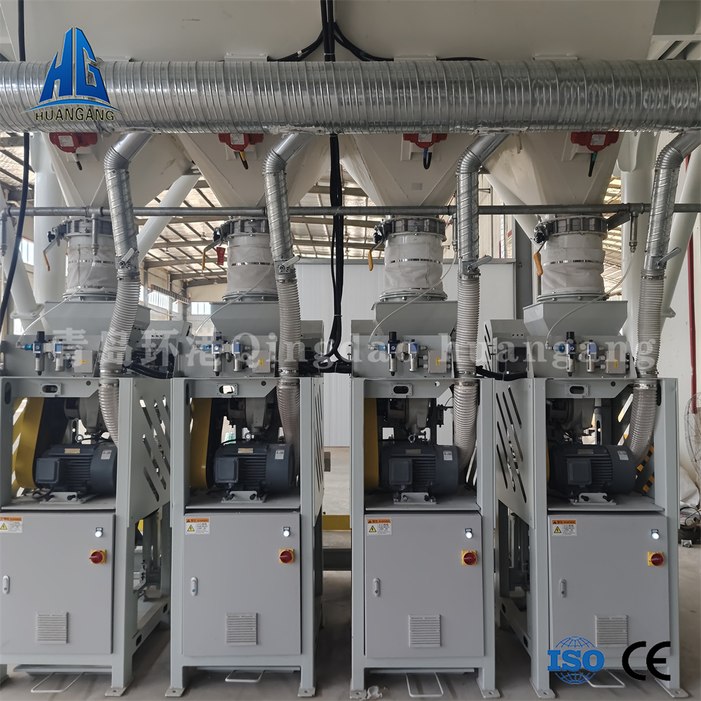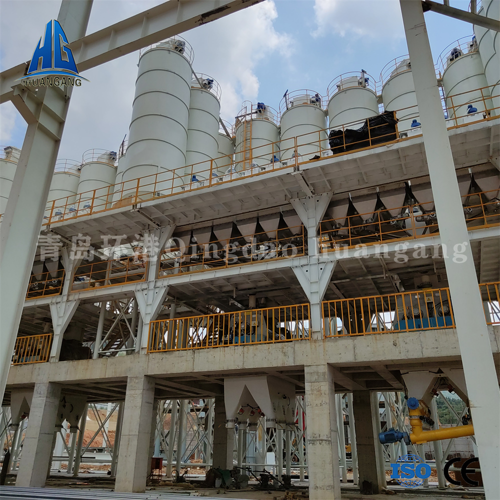 年產(chǎn)兩萬(wàn)噸左右的砂漿生產(chǎn)線,一般情況下會(huì)用到3-6個(gè)原料罐,其中兩個(gè)大罐用于裝放散裝水泥和粉煤灰,其余小罐用于裝放輕鈣、重鈣、砂等。散裝水泥和粉煤灰進(jìn)罐不需要提升設(shè)備,依靠泵車(chē)打入。散裝粉煤灰倉(cāng)一般為圓筒支架結(jié)構(gòu),其上部有除塵設(shè)備,防止粉塵泄漏,下部裝有破拱裝置,防止粉料結(jié)塊,使粉料卸出順暢,并裝有料位傳感設(shè)備,可隨時(shí)掌握倉(cāng)內(nèi)物料使用情況。