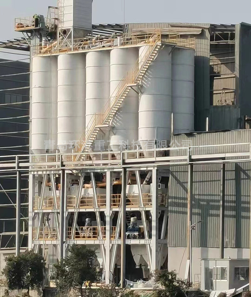 年產(chǎn)兩萬噸左右的砂漿生產(chǎn)線,一般情況下會用到3-6個原料罐,其中兩個大罐用于裝放散裝水泥和粉煤灰,其余小罐用于裝放輕鈣、重鈣、砂等。散裝水泥和粉煤灰進罐不需要提升設(shè)備,依靠泵車打入。散裝粉煤灰倉一般為圓筒支架結(jié)構(gòu),其上部有除塵設(shè)備,防止粉塵泄漏,下部裝有破拱裝置,防止粉料結(jié)塊,使粉料卸出順暢,并裝有料位傳感設(shè)備,可隨時掌握倉內(nèi)物料使用情況。