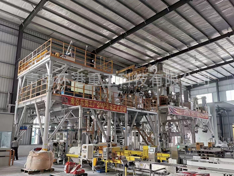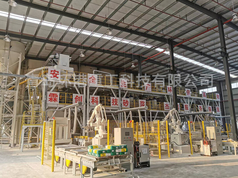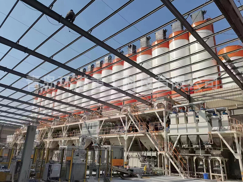 這是一套年產50萬噸的全自動環(huán)保膩子粉成套設備。通過調配原料的比例不同可生產內墻膩子、外墻膩子、普通膩子、鏡面膩子、石膏膩子等多種類膩子粉產品。每小時根據(jù)所選型號不同,可生產10~50噸產品,生產線主樓采用塔式結構,粉料倉安裝在主樓頂部,外加劑系統(tǒng)采用獨立平臺計量泵送。骨料自上而下經過計量層、混合機層、成品倉、包裝機、碼垛線。根據(jù)膩子粉的配方要求,可通過電腦計量精確配料后,經過混合主機攪拌,即時生產出需要的膩子粉產品。全過程采用智能自動化操作模式,減少人力投入。